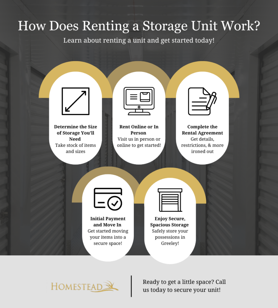 Every now and then we all just need a little space — sometimes literally. We’re Homestead Storage of Greeley, Colorado, and we’ve provided storage in Greeley for thousands of people. If you find yourself in need of some space, you might also have some questions about how the whole process of renting a storage unit works. Luckily, we’re here to help. Read on to learn more about storage unit rental, or call today to secure your own unit!